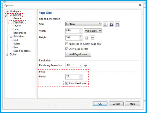 2.3 .在出血面板中,将 2 毫米测量值放在可编辑字段中,并添加显示出血区域.